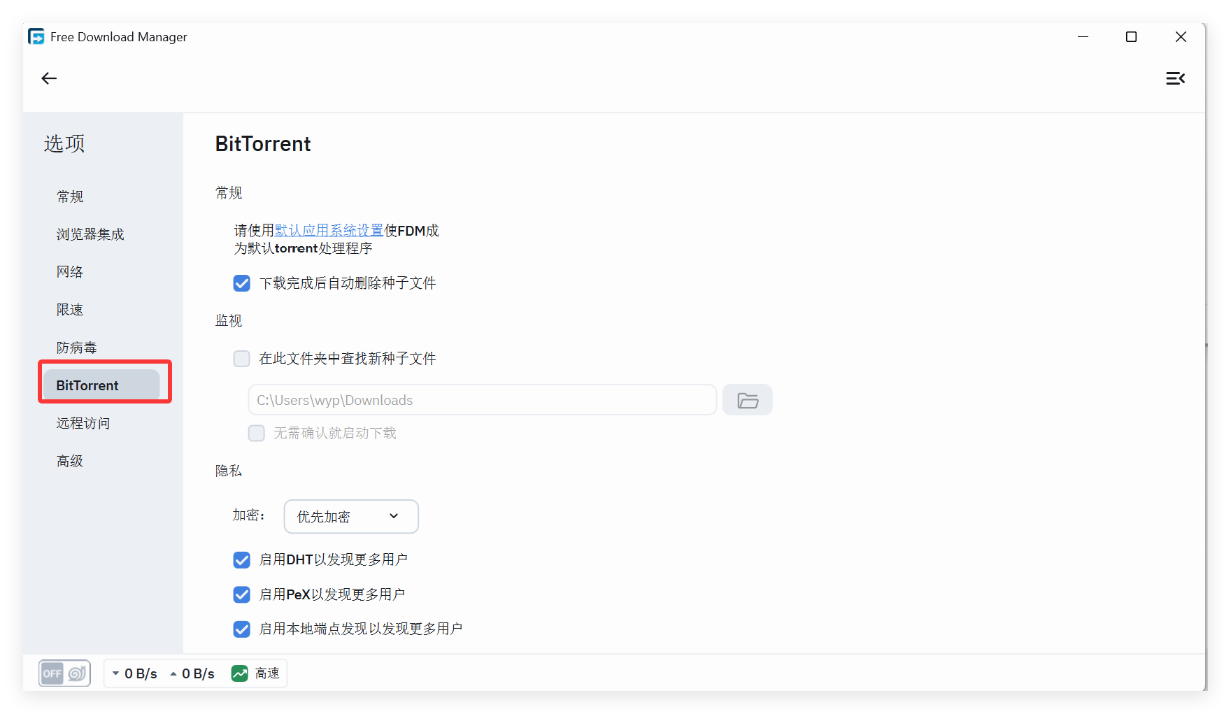 设置方式是:在打开的“选项”中选择“BitTorrent”: