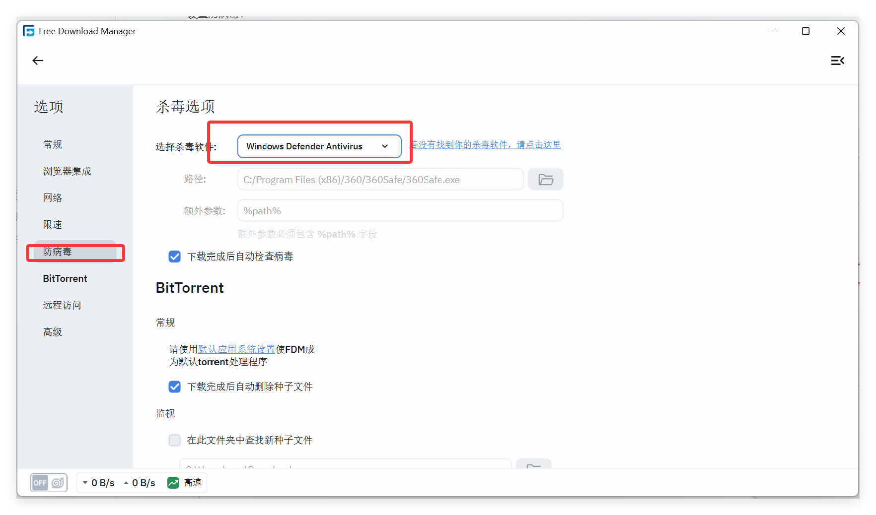 3.3 设置防病毒:设置方式是:在打开的“选项”中选择“防病毒”,并手动定位到杀毒程序: