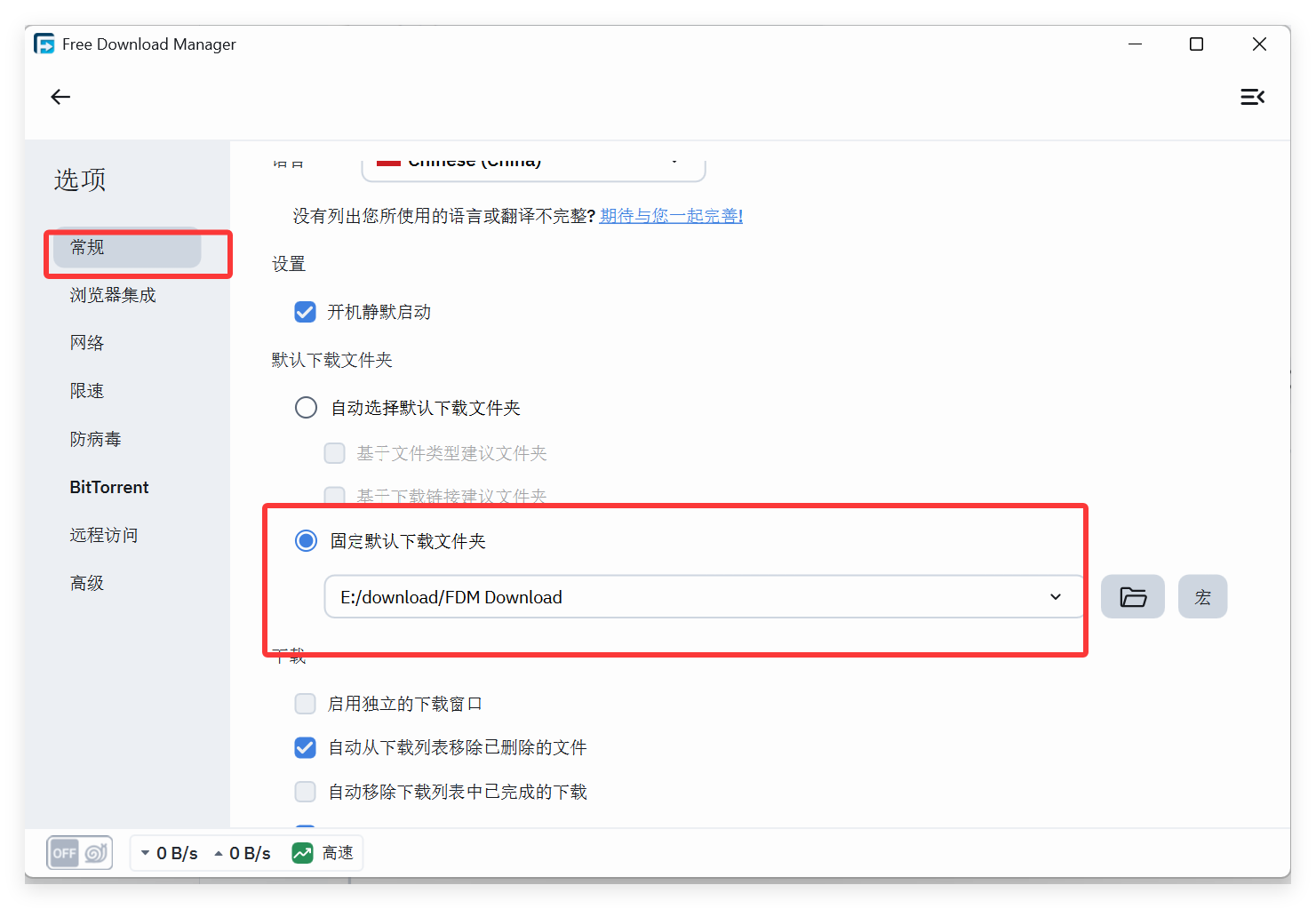 在“选项”菜单中选择“常规”,将默认下载文件夹改为固定路径,如下图所示: