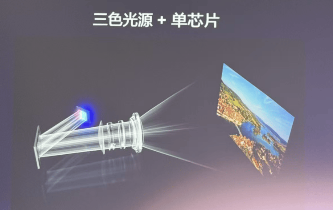 常见的 “三色光源 + 单芯片” 方案逻辑是 “先合后切”:红、绿、蓝三色光经合光镜融合后投射至单芯片,靠芯片高速分时切换成像。这种设计短板明显:分时工作易产生彩虹效应与画面散斑;合光、切换过程中易产生光能损耗,且三原色亮度难均衡,导致 “白色亮度≠色彩亮度”,要么白色偏色,要么色彩饱和度不足。