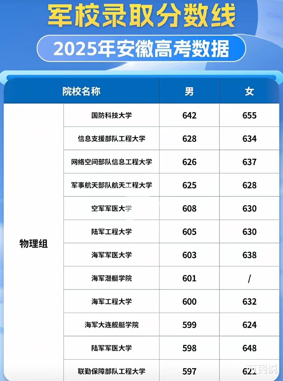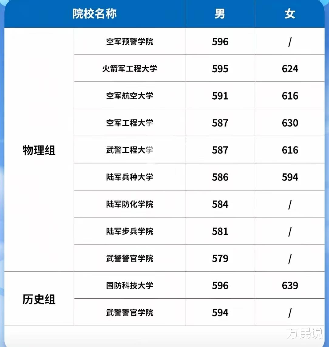 确实更难,但不是没机会。女生分数线普遍比男生高15-20分,招生计划也少。安徽2025年女生物理组最低594分,历史组639分。女生如果真心想从军,分数够硬、体检过关,完全可以冲,但一定要做好保底志愿。