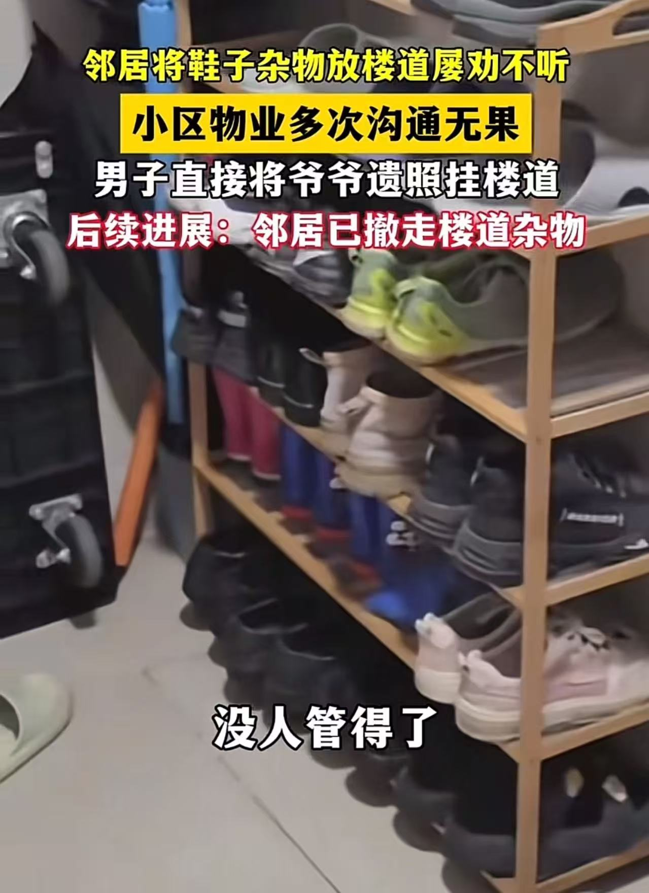 他想跟李先生理论,可看着遗照又不敢敲门,纠结了半天,最后实在扛不住这 “压迫感”,连夜找了朋友帮忙,把楼道里的鞋架、杂物全搬回了自己家,连一点垃圾都没剩下。