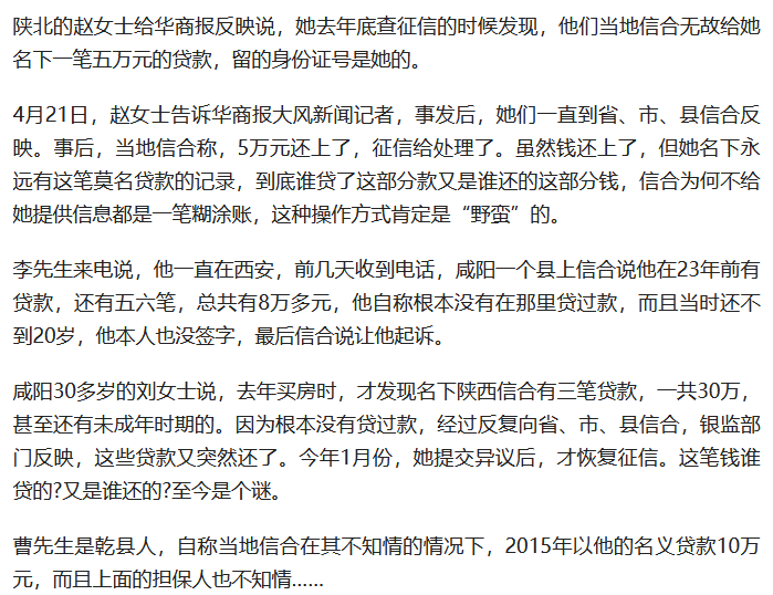 2023年4月24日,华商报曝光了陕西省农村信用社联合社多起“被贷款”事件,其中还有一农妇因为被暴力催债下,精神崩溃而服毒自杀。而记者拨通信合的工作人员电话时,得到的态度却是极为不耐烦的,还称“一辈子解决不了”。