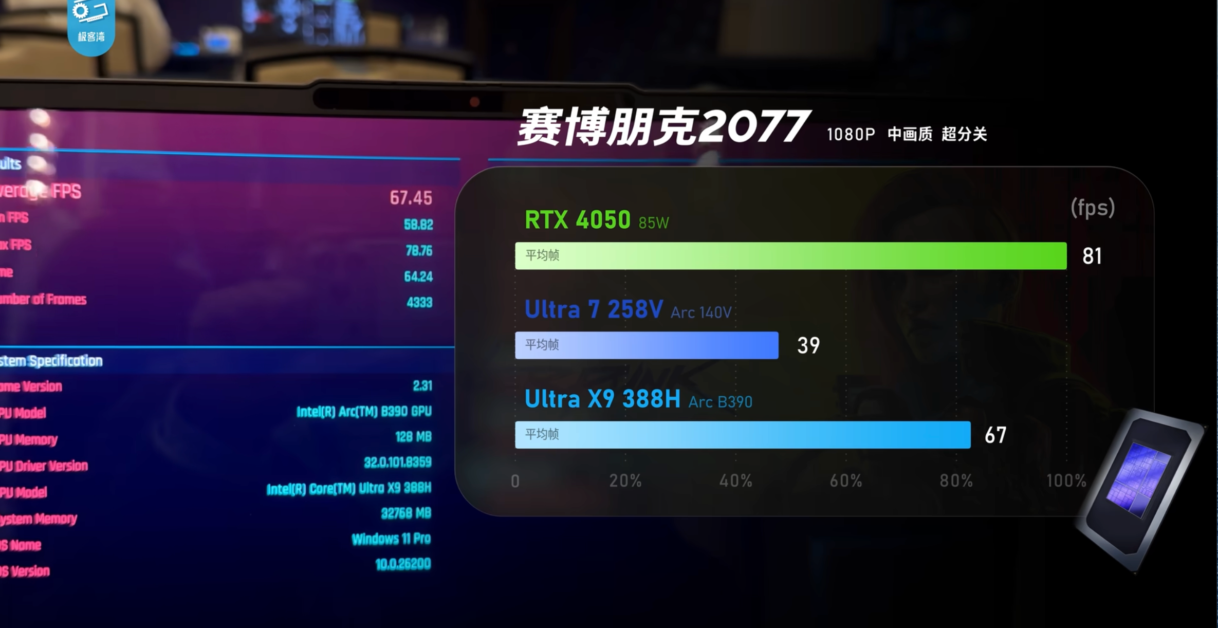 不过要说最有意思的,还是全新的GPU,采用第三代Xe核心,12Xe满血版集成12个Xe核心、从极客湾的体验来看,锐炫B390核显的性能堪比60W功耗的RTX 4050独立显卡,在《赛博朋克2077》中也可以轻松跑到跑60-70帧,使轻薄本运行3A游戏成为可能。
