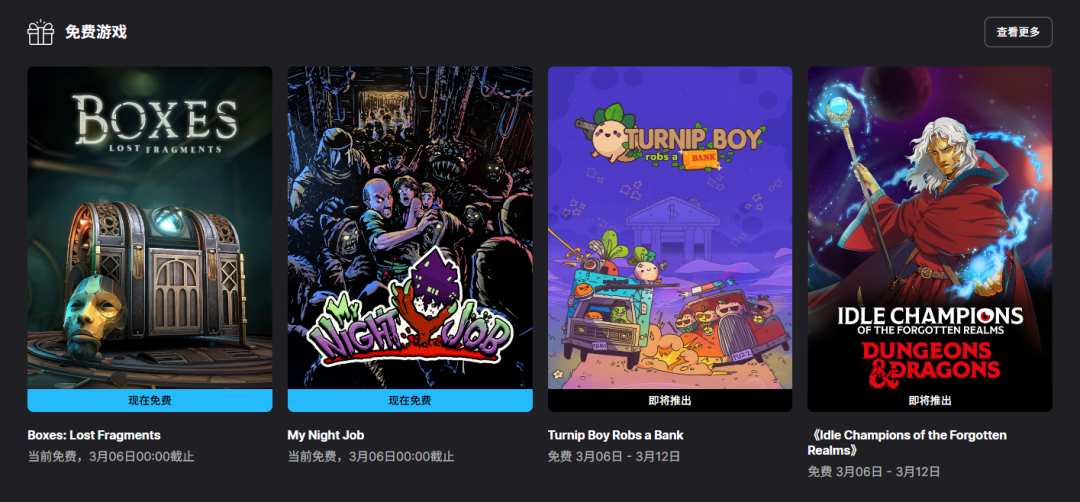 本周Epic商店送出的游戏是《盒子:丢失的碎片》和《我的夜间工作》,两个都支持中文,领取时间截止到3月06日0点。