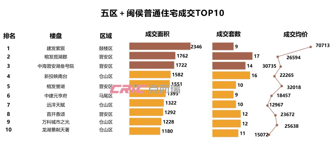 第三方机构克而瑞公布的最新周报(2024.12.16-12.22)显示(下图),福州主战场(五区+闽侯)单盘成交面积与成交金额,TOP1是独一档的存在。