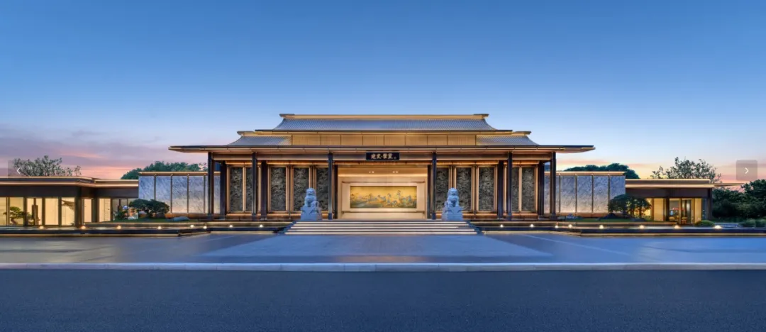 这里,屋顶的「穹顶飞檐」,从宋徽宗《瑞鹤图》中取境,取用「松鹤翎羽」的造型设计飞檐翘脚,香槟金艺术铝板与飞檐飘逸的弯曲度,「金缕格栅」装饰,环长超百米的金属格栅,是深研古典文献与画作意图,复原了【紫宸殿】的气势。