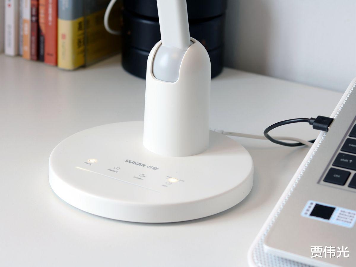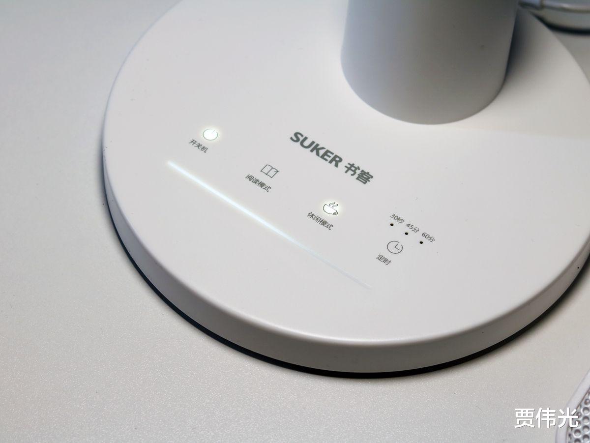 底座上面是各种触摸按键,从左到右依次是开关键、阅读模式、休闲模式、定时开关,阅读模式就是100%亮度,休闲模式则是50%亮度,手指在按键下方的调光条滑动,可以进行亮度调节,一共有7个档位可以切换。