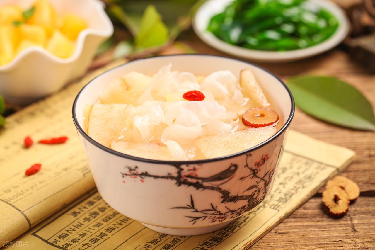 做法:银耳泡发后撕成小朵,雪梨去皮切块。将银耳、雪梨、山楂、枸杞一同放入砂锅,加足量水。大火烧开转小火慢炖1-1.5小时,至银耳软糯粘稠。出锅前5分钟放入枸杞。利用雪梨和枸杞的天然甜味,无需额外加糖。