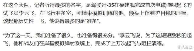解放军报于近日发表了题为《与航母“三剑客”一起成长》的报道文章,对解放军海军舰载机试飞员这一不平凡的群体和职业进行了披露,其中一段话是这样写的:“在这个大队,记者听得最多的名字,是驾驶歼-35在福建舰完成首次电磁弹射起飞的试飞员李云飞……‘为了这一天,我们准备了很久,也准备得很充分。’李云飞说,为了这短短数秒的起飞,他和战友们在岸基模拟弹射系统上,完成了上万次起飞与阻拦演练。”
