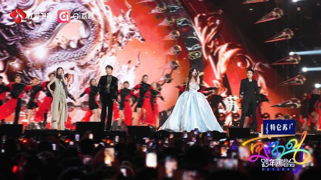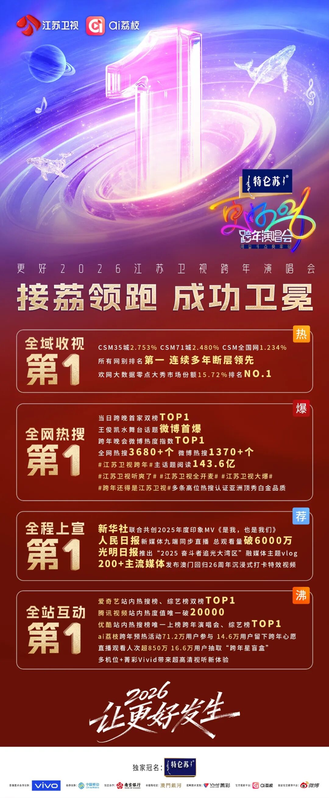 整台晚会全维度成功卫冕!全域收视第一:CSM35城收视2.753%,CSM71城收视2.480%,CSM全国网1.234%,所有网别排名第一,连续多年断层领先!欢网大数据零点大秀市场份额排名第一;全网热搜第一:当日跨晚首家双榜TOP1,跨年晚会微博热度指数TOP1,晚会获全网热搜超3680+次,其中微博热搜超1370+次,王俊凯水舞台话题获微博首爆,#江苏卫视跨年# 主话题阅读143.6亿,#江苏卫视听爽了# #江苏卫视全开麦# #江苏卫视大爆# #跨年还得是江苏卫视# 多条高位热搜认证亚洲顶秀白金品质;全程上宣第一:与新华社联合共创2025年度印象MV《是我,也是我们》致敬每一个平凡的你我,人民日报新媒体九端同步直播,总观看量破6000万,光明日报推出“2025奋斗者追光大湾区”融媒体主题vlog,200+主流媒体发布澳门回归26周年沉浸式打卡特效视频,共同祝福澳门会明天更好;全时互动第一:江苏广电总台“ai荔枝”客户端跨年预热活动71.2万用户参与,14.6万用户留下跨年心愿,直播观看人次超850万,16.6万用户抽取“跨年星盲盒”,多机位+菁彩Vivid带来超高清视听新体验。