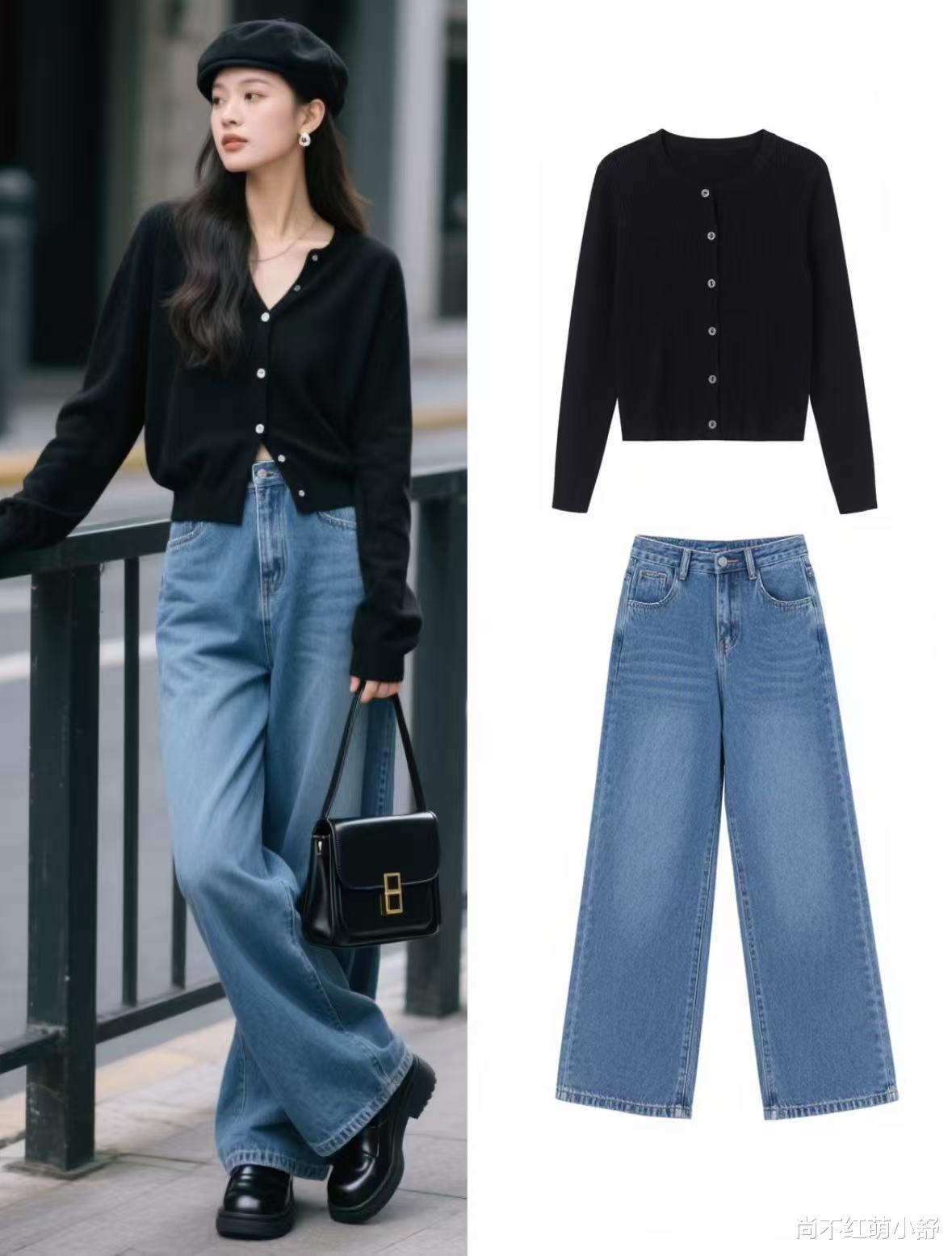这是最经典的“上短下长”组合。短款针织衫明确标出腰线,高腰直筒牛仔裤从腰部开始直线向下,完美隐藏臀腿,显得腿又长又直,乐福鞋的利落感与裤型无缝衔接,整体显瘦又显高。