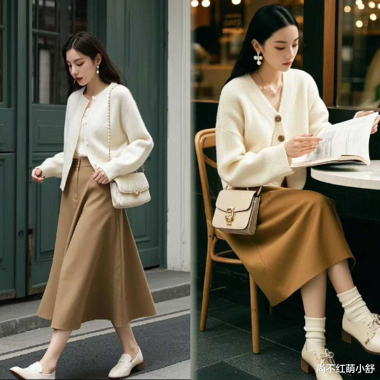 浅色上衣+深色下装是最基础、最不会出错的梨形配色法则。像博主这套白色针织衫 + 棕色半身裙就不错,遮盖赘肉的同时又不失时尚感。