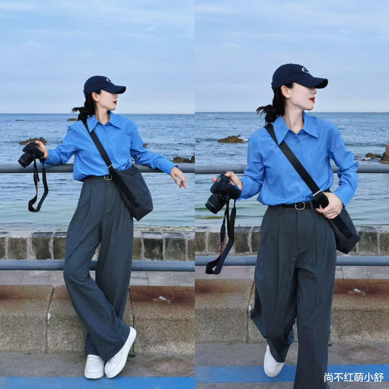 Look 2:高腰阔腿西装裤+翻领衬衫 +小白鞋