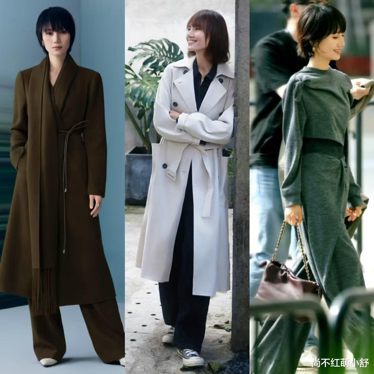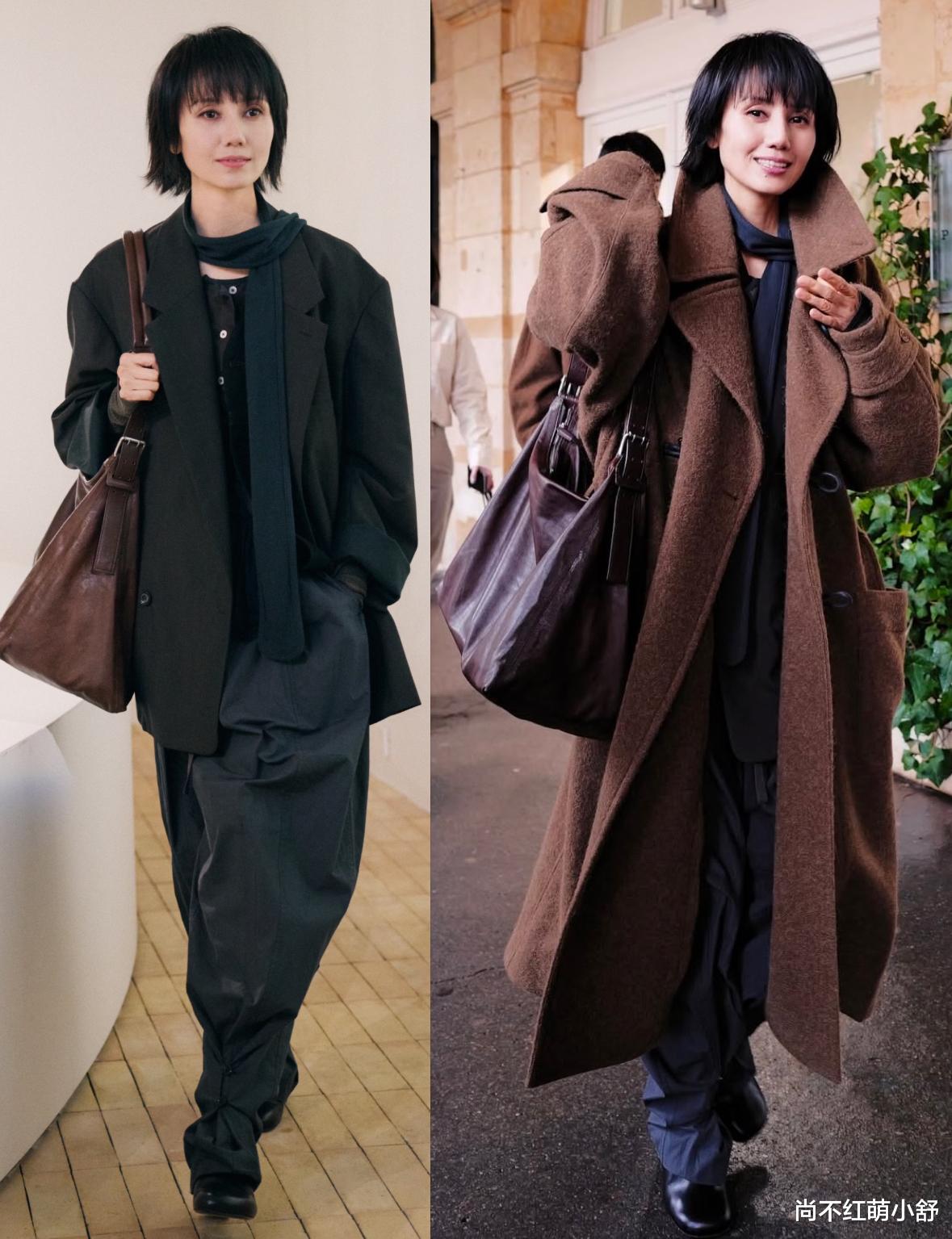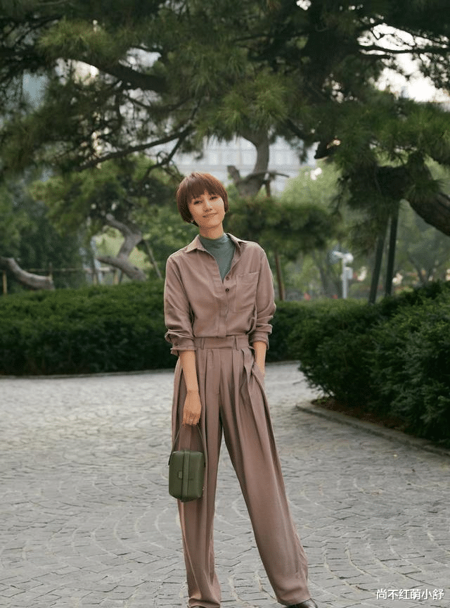 这八个字是袁泉的穿搭圣经。她的衣橱里黑白灰占70%,大地色系占20%,偶尔用酒红、墨绿做点缀。所有衣服都遵循“线条流畅、剪裁利落”原则,没有破洞、铆钉、印花这些多余装饰。就连短发都保持“层次分明、长度及耳”,不烫大波浪不染夸张发色,这种“克制感”反而让她在流量明星里成了清流。