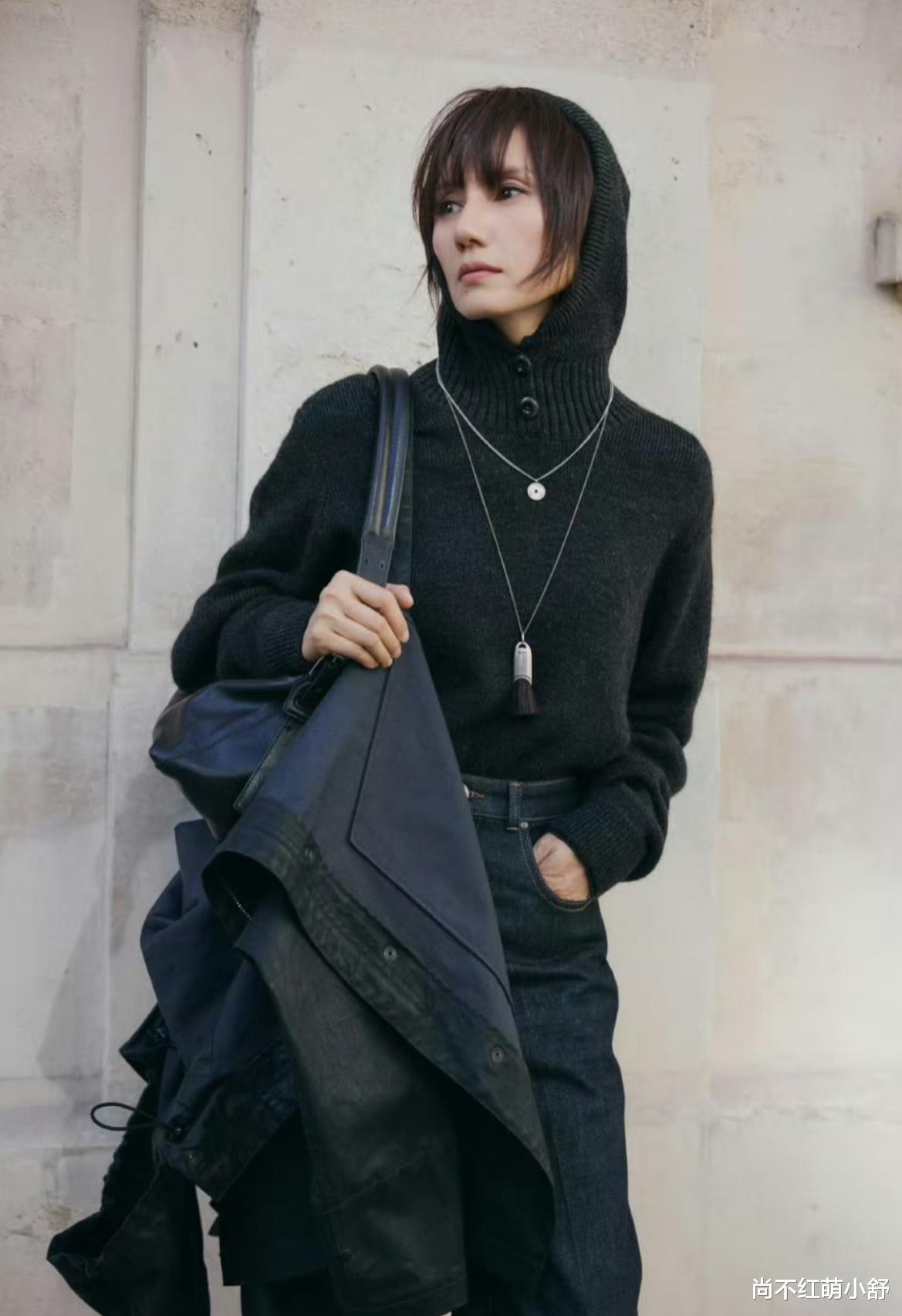 毛衣选款三不原则: 不选oversize(压个子)、不选大logo(显廉价)、不选紧身款(局促)。袁泉的黑色毛衣是“微落肩”版型,肩头比肩线多0.5厘米,藏住40+最头疼的厚肩;衣摆开口直径≤2cm,坐下不堆、起身不鼓。颜色锁定“中性灰度”——雾灰、燕麦、烟蓝,饱和度高一度就留给街拍博主,咱们普通人穿纯色款最衬肤色。