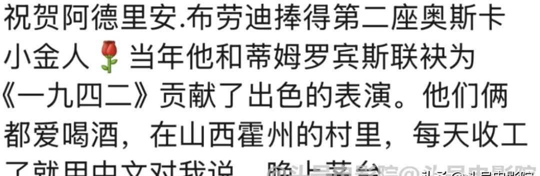 除了这两部让他获得奥斯卡影帝的电影,阿德里安·布劳迪还参演过许多其他作品,其中包括中国导演冯小刚的《一九四二》。