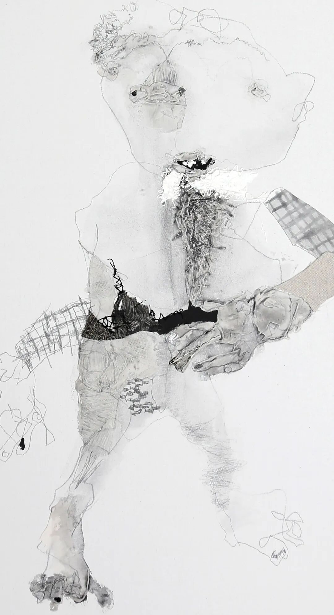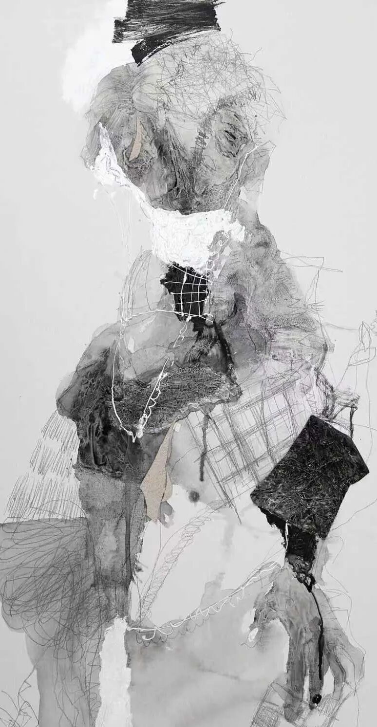以上作品为参展作品,是水性综合材料绘画。我是戴眼罩绘制的,左手(非惯用手)持笔在画布上直接起稿,画成什么样预先不可知,睁开眼睛时是什么样就什么样,画错了的线条我也会将它保留。这些“错误”具有松弛感,是我画面不可或缺的形式之一。我还自制了一套水墨肌理表现技法,以黑白灰构成为主,配以铅笔、拼贴等材料,这套语言与我的个人精神品格相吻合。完成这些形象后,我会利用AI来给它们取名字,当AI看到这幅作品时,给出了许多有趣的参考,我选择了其中一个作为标题——《后人类毛发管理条例》。