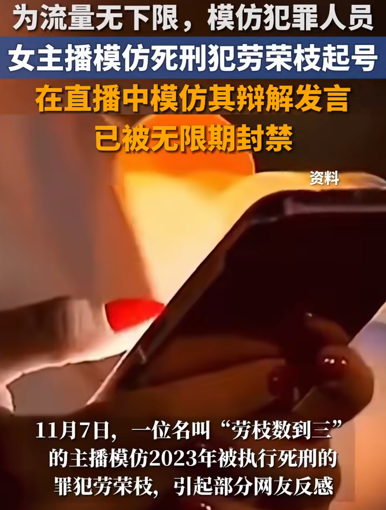 最近,一个叫“劳枝数到三”的主播在直播圈里掀起了轩然大波。这位来自河北的主播,为了博眼球、赚流量,竟然公然模仿起2023年被执行死刑的罪犯劳荣枝,在直播里多次重复劳荣枝在法庭上的那些辩解发言。这一行为,瞬间点燃了网友们的怒火,大家纷纷表示“这简直毫无底线”!
