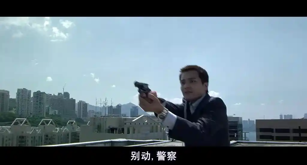 这种构图存在风水方面的讲究,处在左侧位置的刘建明身后存在高楼,类比于靠山这一意象,以此来彰显地位,位于右侧的陈永仁背后是海,并且其举枪呈现出向上的角度,这般景象看上去极具危险性。这部电影所具备的厉害之处在于,无论是正面一方还是反面一方,均能让观众产生喜爱之情。观众此时正沉浸于两人进行对决的画面当中,全然不会感觉到紧张。