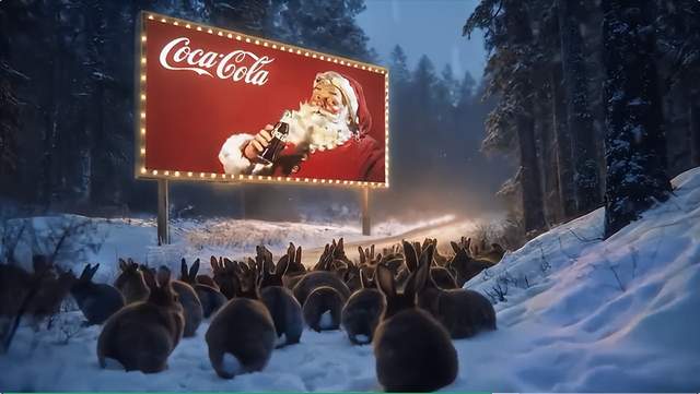 去年因AI圣诞广告被骂上热搜的可口可乐又推出AI圣诞广告了。有意思的是,今年的圣诞广告是致敬去年的,而去年的是致敬1995年的——夜幕之下,红色的可口可乐卡车车队穿过山林村镇,沿途的海豹、兔子、小狗等动物纷纷望向车队,眼里满是惊喜和期待。创意上可以说没有一点,画面表达也被网友吐槽“阴间”,可口可乐想营造的圣诞氛围,用户感受不到。