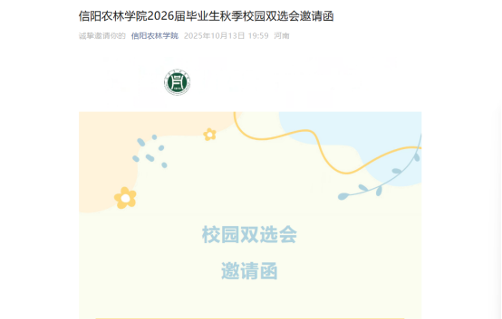 为深入贯彻党中央、国务院关于高校毕业生就业工作的决策部署,积极搭建毕业生与用人单位之间的交流桥梁,信阳农林学院携手信阳市人力资源和社会保障局,定于2025年11月14日在信阳农林学院运动场举办“豫荐未来 青春启航”2026届毕业生秋季供需双选会。此次活动旨在促进毕业生高质量充分就业,为用人单位输送优秀人才。