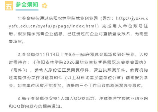 为方便用人单位参与,双选会特别设置了便捷的报名渠道。自2025年10月10日起至11月10日止,用人单位可通过信阳农林学院就业创业网完成账号注册及报名流程。已注册企业可直接登录报名,简化流程,提高效率。报名详情及流程可参考附件《用人单位参会报名流程》。