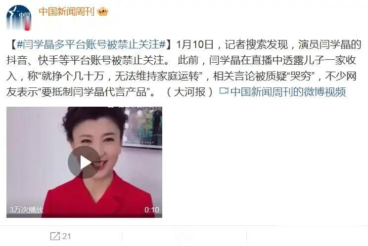 不知道闫学晶如果知道自己几句话会有这样的后果会不会后悔。原本之前希望通过直播让生活更好,这下反而让原本的工作都没了。