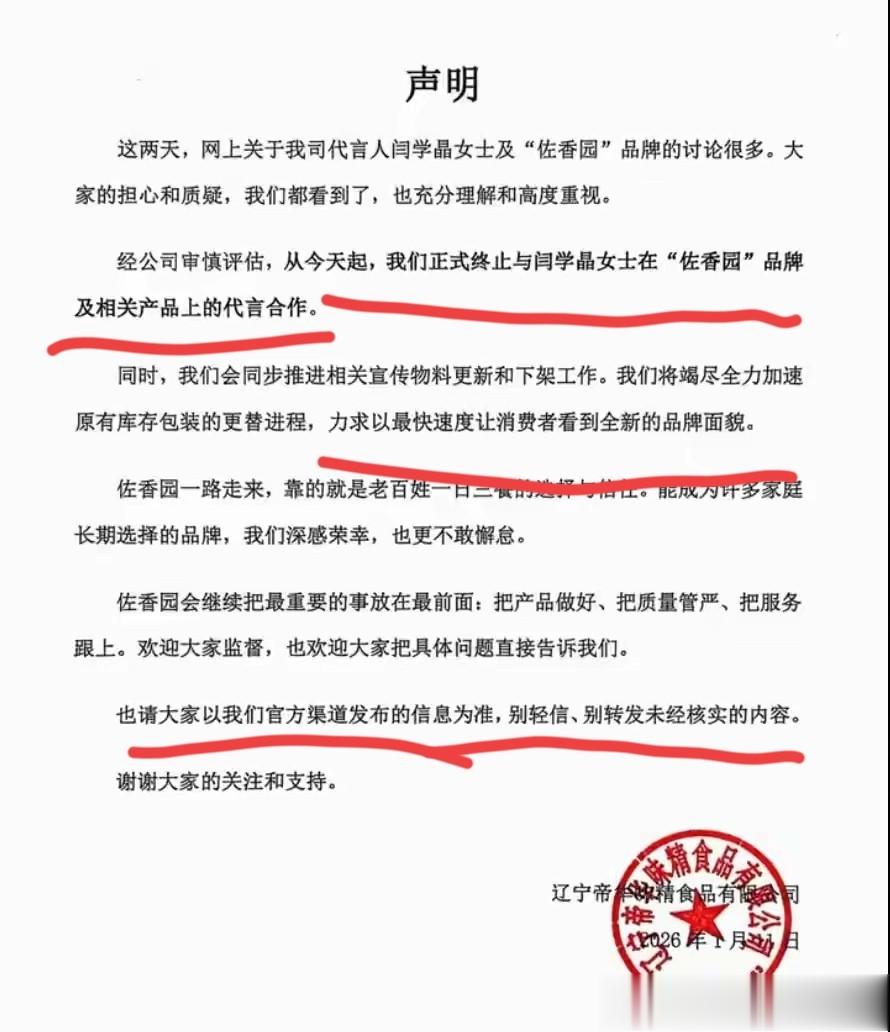 然而在1月11日,该品牌就发文终止与闫学晶的合作,公司理解网友的担心和质疑,品牌方也一直在关注舆情,经过公司的评估,从1月11日起,已经终止了与闫学晶的合作,并且会尽快推进物料更新和下架工作,希望大家能够看到全新的品牌面貌。