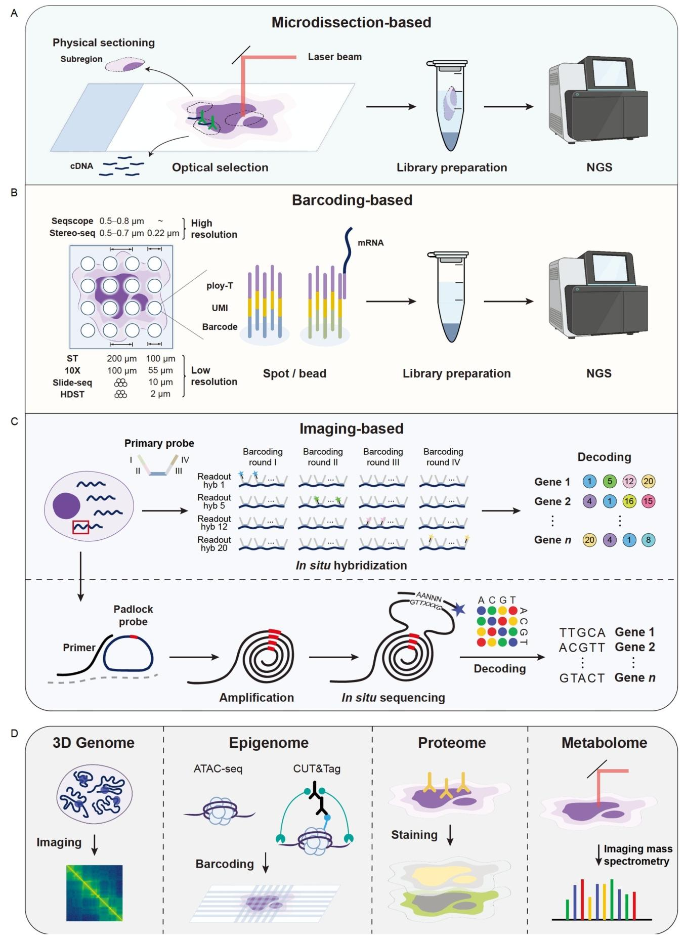 多模态与空间转录组技术:多模态技术实现同一细胞多组学联合分析(如 RNA+ATAC),空间转录组通过微 dissection、条形码标记等策略保留空间信息,解析组织微环境与细胞互作(配图 14:空间转录组技术原理)。