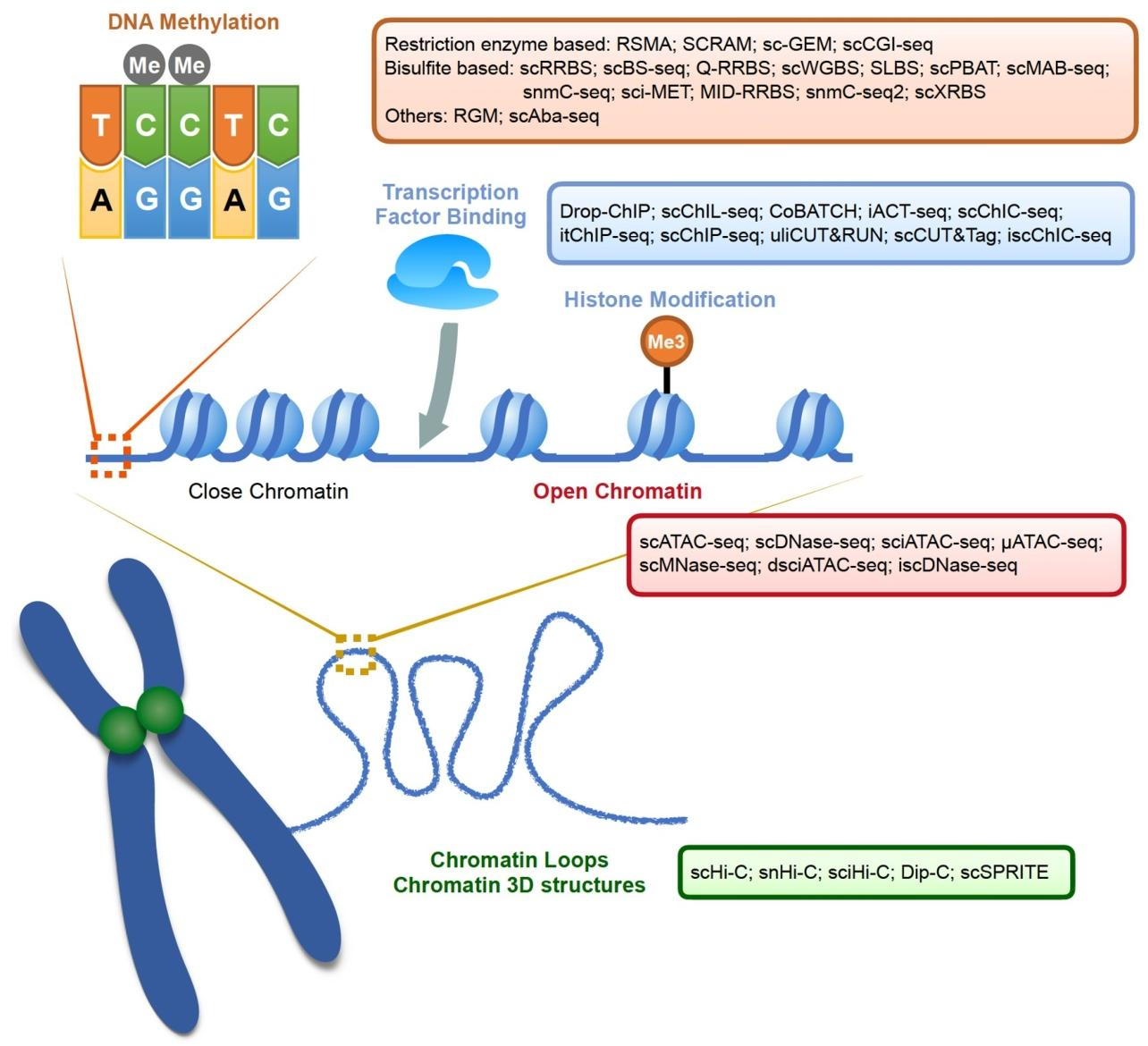 单细胞表观组测序:覆盖 DNA 甲基化、染色质可及性等多维度,技术包括 scRRBS、scATAC-seq 等,通过针对性计算工具解决数据稀疏性问题,助力胚胎发育与肿瘤免疫机制研究(配图 6:单细胞表观组测序技术概览)。