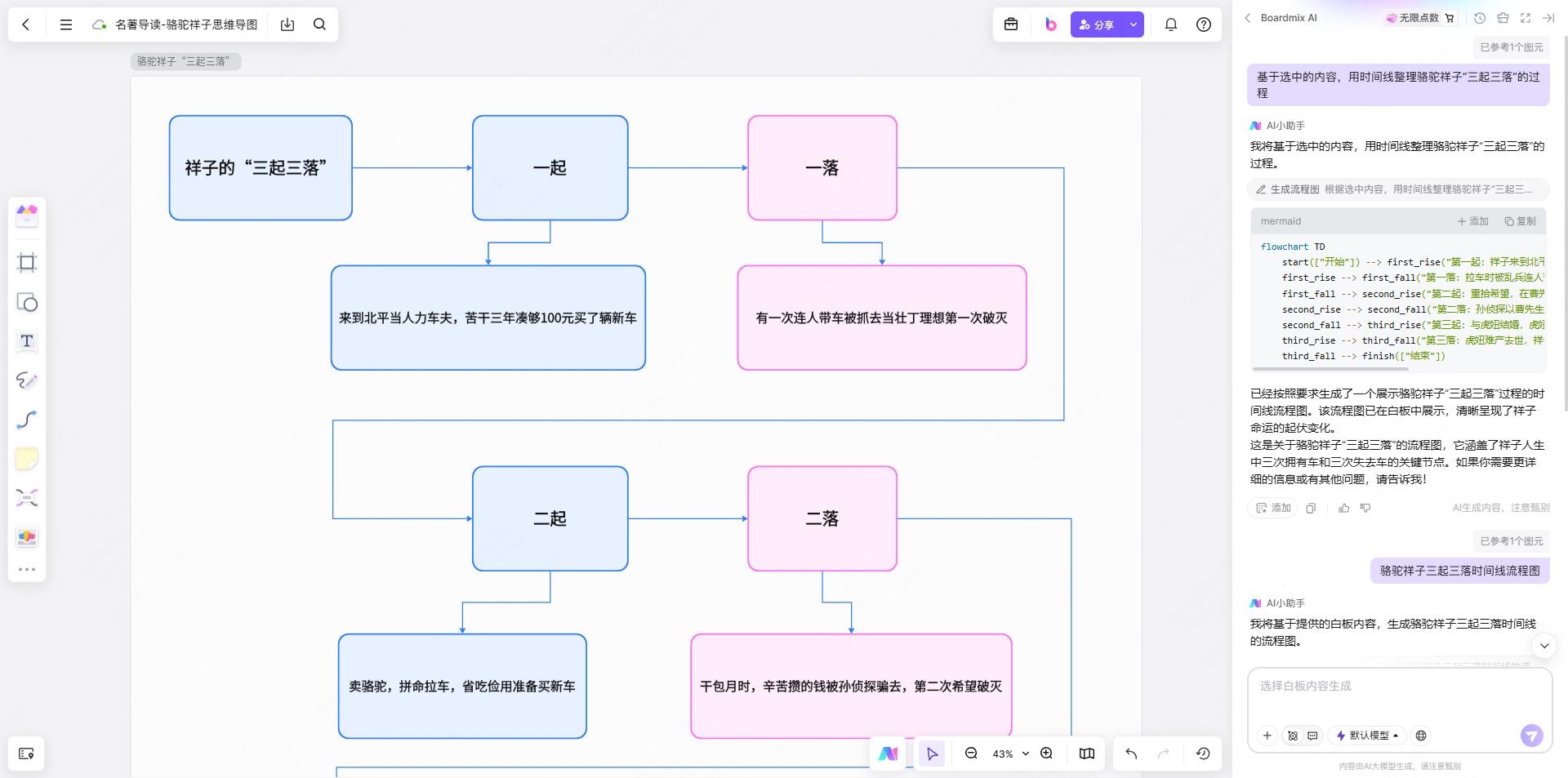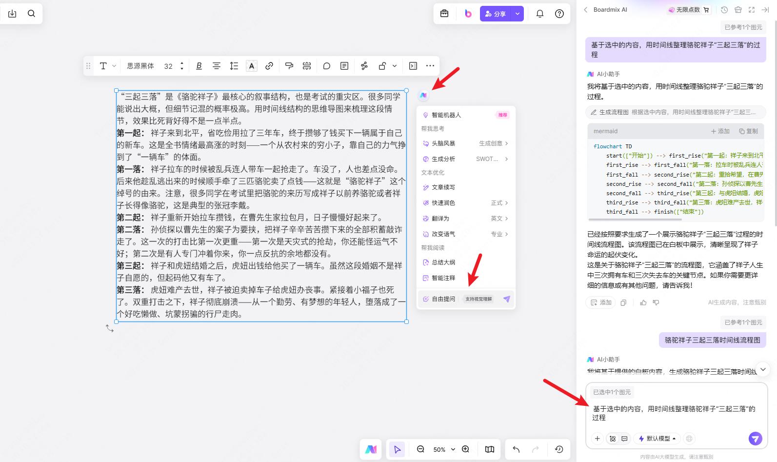 这里要特别推荐boardmix的“AI自动生成思维导图”功能:输入骆驼祥子三起三落情节梳理,AI几十秒就能拉出一版时间线框架,基本的事件和人物都会填好。AI生成的内容不一定百分百准确,但检查修改几处细节就能直接用。对于那种知道该写什么但不想从头搭框架的孩子来说,这个功能特别省事。