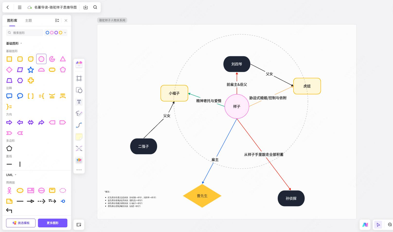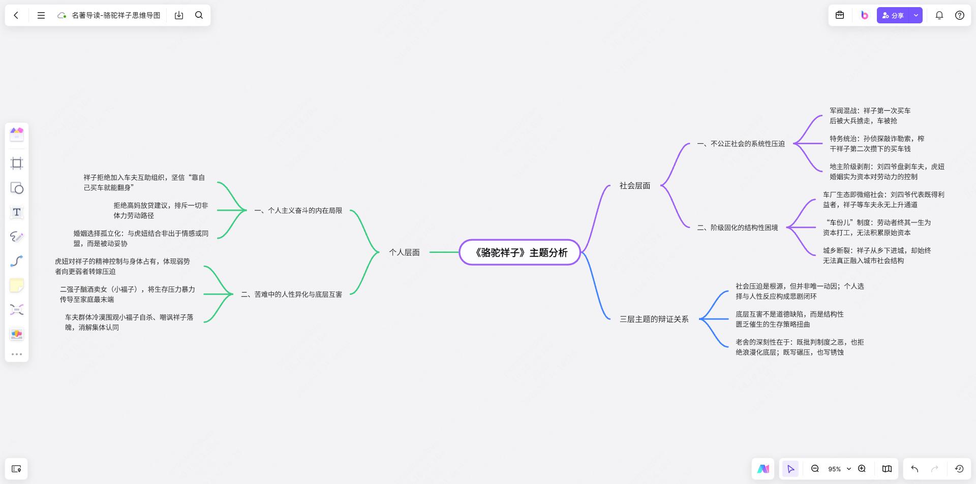 做这张导图有个技巧特别管用:用不同颜色的连线表示不同类型的关系。红色表示伤害/压迫关系,蓝色表示雇佣/经济关系,绿色表示情感/依附关系,橙色表示控制/畸形关系。涂完颜色之后,一眼就能看出——祥子身上的红色线条远远多于其他颜色,这本身就说明了他处境的残酷。