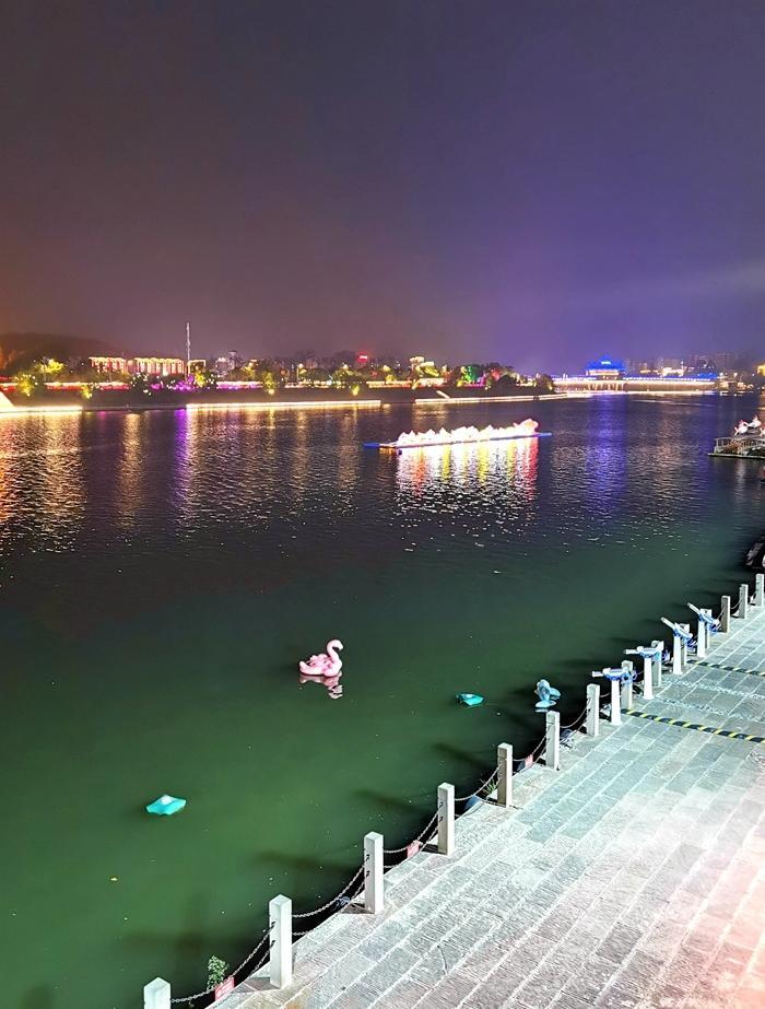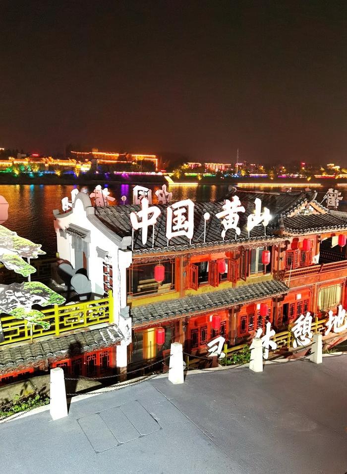 因屯溪老街坐落在横江、率水和新安江三江汇流之处,我来到了屯溪河街,在江边游览,水边的夜景更好看,有装饰得很好看的游船,两岸璀璨的灯火,古色古香的楼台亭阁,真如同走进了清明上河图。