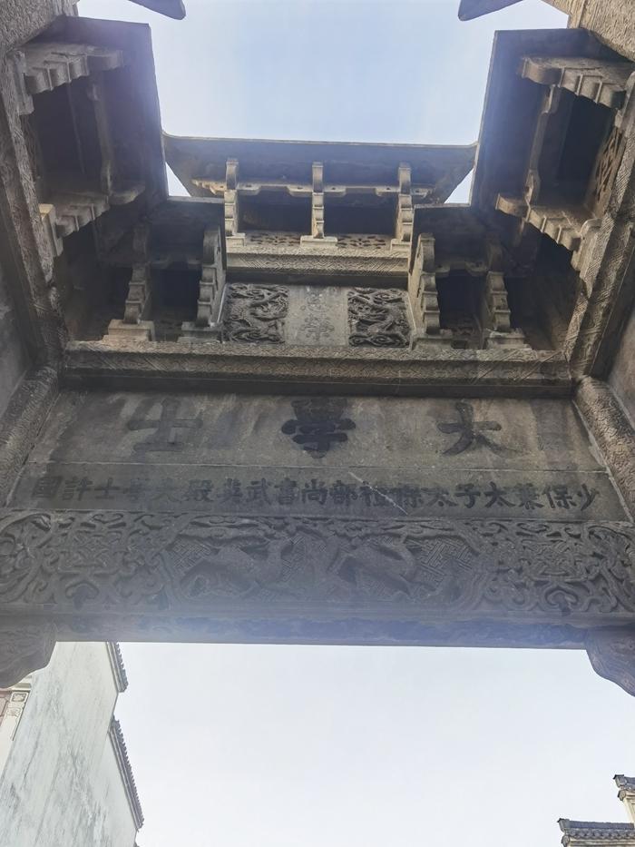 我来到许国石坊。 这座全国唯一的八角牌坊,建于明万历十二年(1584年),为旌表少保兼太子太保、礼部尚书、武英殿大学士许国而建。石坊呈四面围合结构,由前后两座三间四柱三楼式牌坊和左右两座单间双柱三楼式牌坊组合而成,被誉为“东方的凯旋门”。