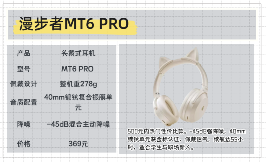 漫步者MT6 PRO产品定位与价位作为500元以内的头戴式耳机,它是2026年的热门性价比款型,把主动降噪、高音质、长续航这些核心功能都做了到位,价格却很亲民,完美贴合学生和职场新人的需求。