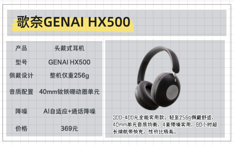 如果你看重佩戴舒适,需要长时间戴耳机:选GENAI HX500,256g的轻盈机身,久戴不压头不硌耳,办公、追剧、轻度运动都合适,300-400元的价格也很亲民。