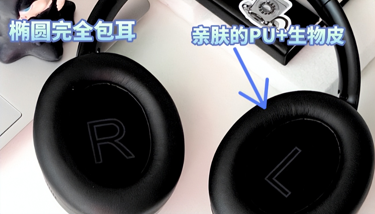 整机仅重256g,拿在手里轻得像个小物件,戴在头上几乎感觉不到重量,就连戴眼镜的用户也不会觉得耳罩硌着镜腿。耳罩采用亲肤的PU+生物皮的材质,摸起来细腻柔软,贴在脸上没有廉价皮革的生硬感。