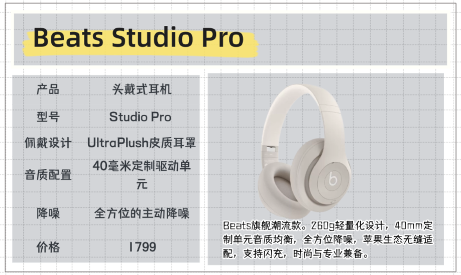 Beats Studio Pro产品定位与价位作为Beats的旗舰款,主打“潮流+专业”,针对喜欢Beats品牌、追求高品质体验的消费者,尤其是苹果用户,能完美适配生态系统。