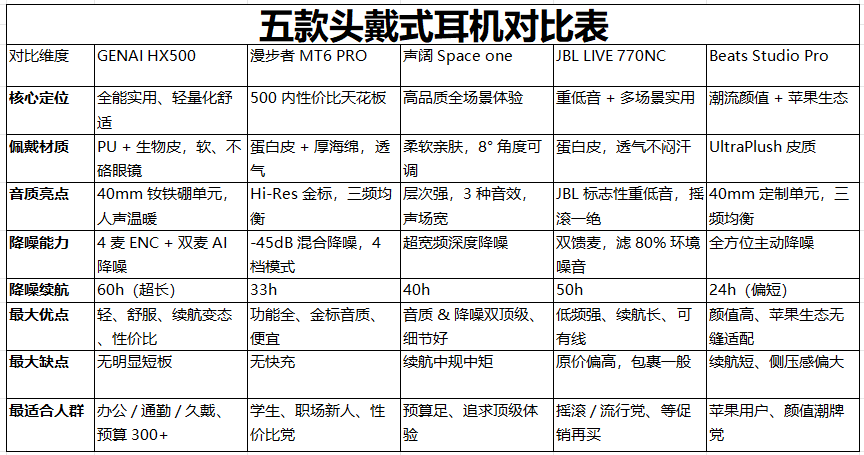 这次我干脆把呼声最高的五款通用耳机都买了回来——GENAI HX500、漫步者MT6 PRO、声阔Space one、JBL LIVE 770NC、Beats Studio Pro。接下来我会从我们平常最关心的维度展开测评:比如戴一天耳朵会不会疼、地铁里通话清不清楚、续航能不能撑过一周通勤,甚至连连接稳定性、音质够不够满足流行歌聆听需求这些细节都不会放过。