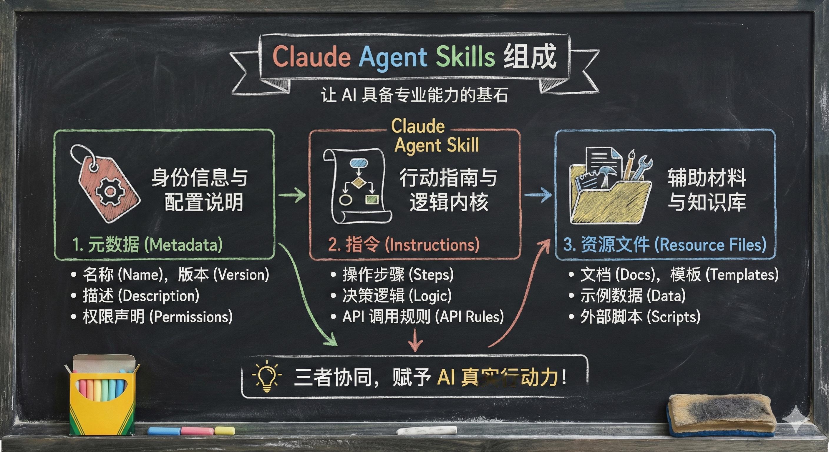 元数据 (Metadata): 包含对这个技能的简短描述。它保存在全局上下文中,因为体积小,所以非常节省 Tokens(省钱又省心)。行动指南 (Action Guide): 这部分才是真正的提示词,规定了 AI 每一步该怎么做。资源文件 (Resources): 这是最厉害的地方!它可能包含 Python 代码 或其他执行程序,保证程序在调用 Skill 时能完成复杂的动作。举个栗子:让 AI 突破“次元壁”为什么说它是升级版?