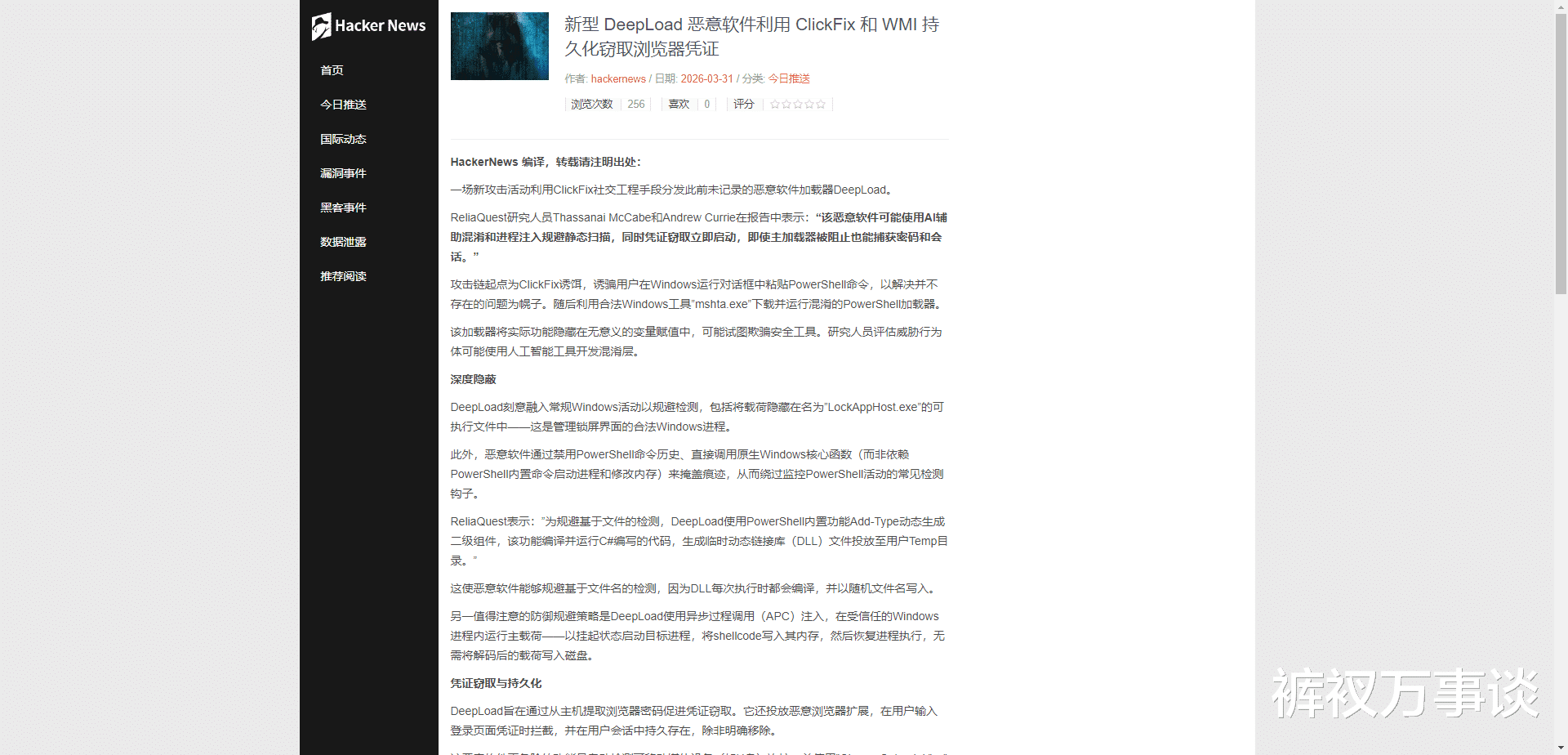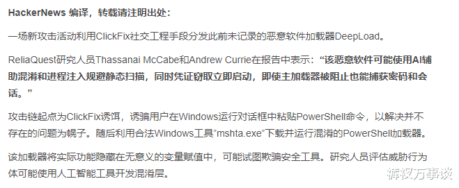 事情是这样的。3月31号,安全公司ReliaQuest发了个报告,说有一种新型恶意软件叫DeepLoad,专门偷浏览器密码。它怎么进来的?用的是ClickFix手法——骗子让你在Windows运行框里粘贴一段PowerShell命令。比如“你的电脑卡了,按Win+R,粘贴这个就好了”。你照做,它就进去了。