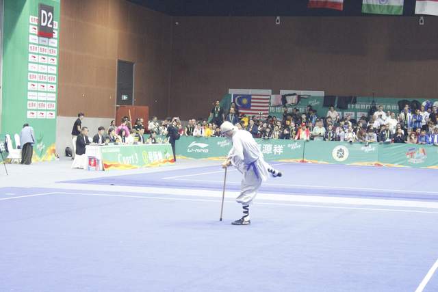 有个美国老头演练的是拐杖,上了年纪,但他的兵器和吃席板凳有得一拼,武术不分年纪。