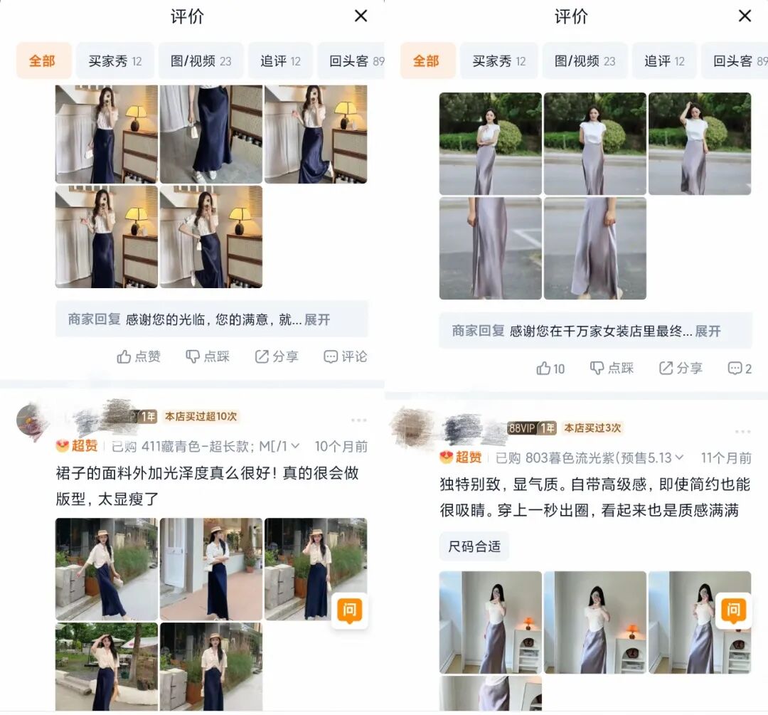 比如一家女装店铺的评价区,网友发布的买家秀首图,是挂在衣架上的衣服,和同款穿搭的模特合影。