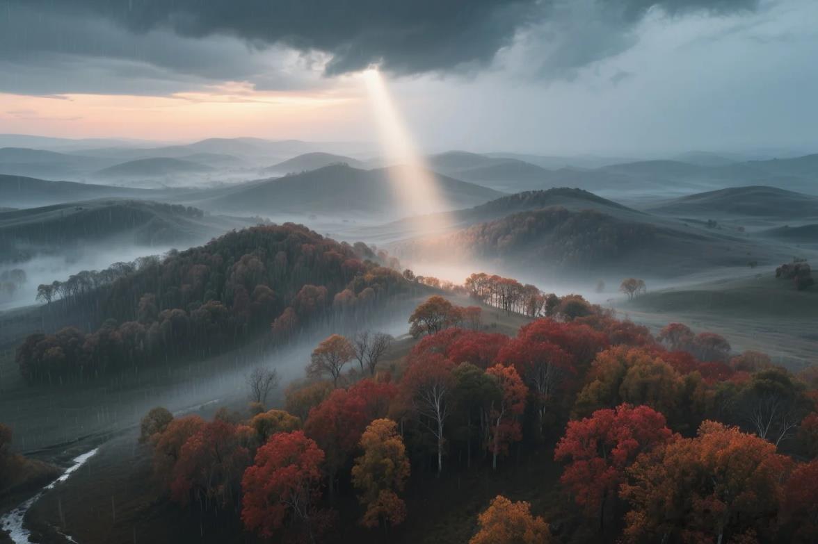 这里风云变幻,透出云逢的夕阳,照射到一片过雨的枫林。