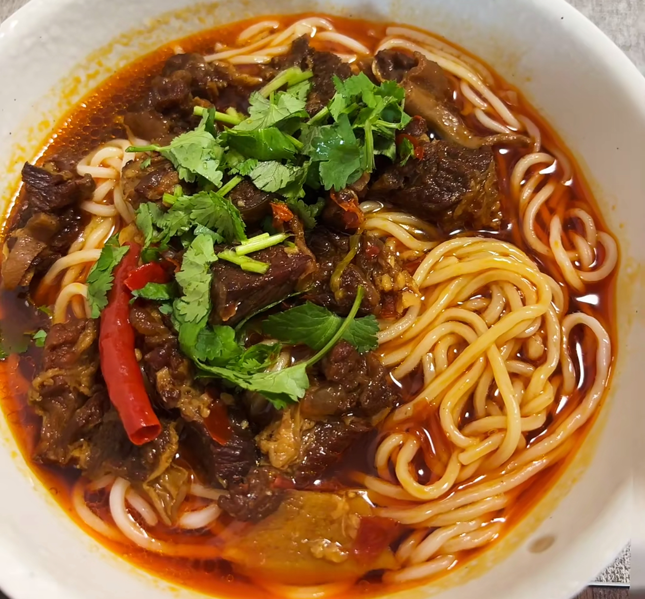 这道牛肉面的灵感,源自一次偶然的街头邂逅。那天我下班回家,又累又饿,路过一个不起眼的小面馆。被里面飘出的香味吸引,忍不住走了进去。点了一碗牛肉面,当那碗面端到我面前时,我瞬间就被惊艳到了。牛骨熬制的浓白汤底,散发着诱人的香气,鲜切牛肉在汤里若隐若现,搭配上翠绿的葱花和红亮的辣油,光是看着就让人食欲大增。吃上一口,那味道直接在我嘴里炸开,从此我便对这道牛肉面念念不忘。后来,经过多次尝试和改良,我终于做出了属于自己的家常版牛肉面。