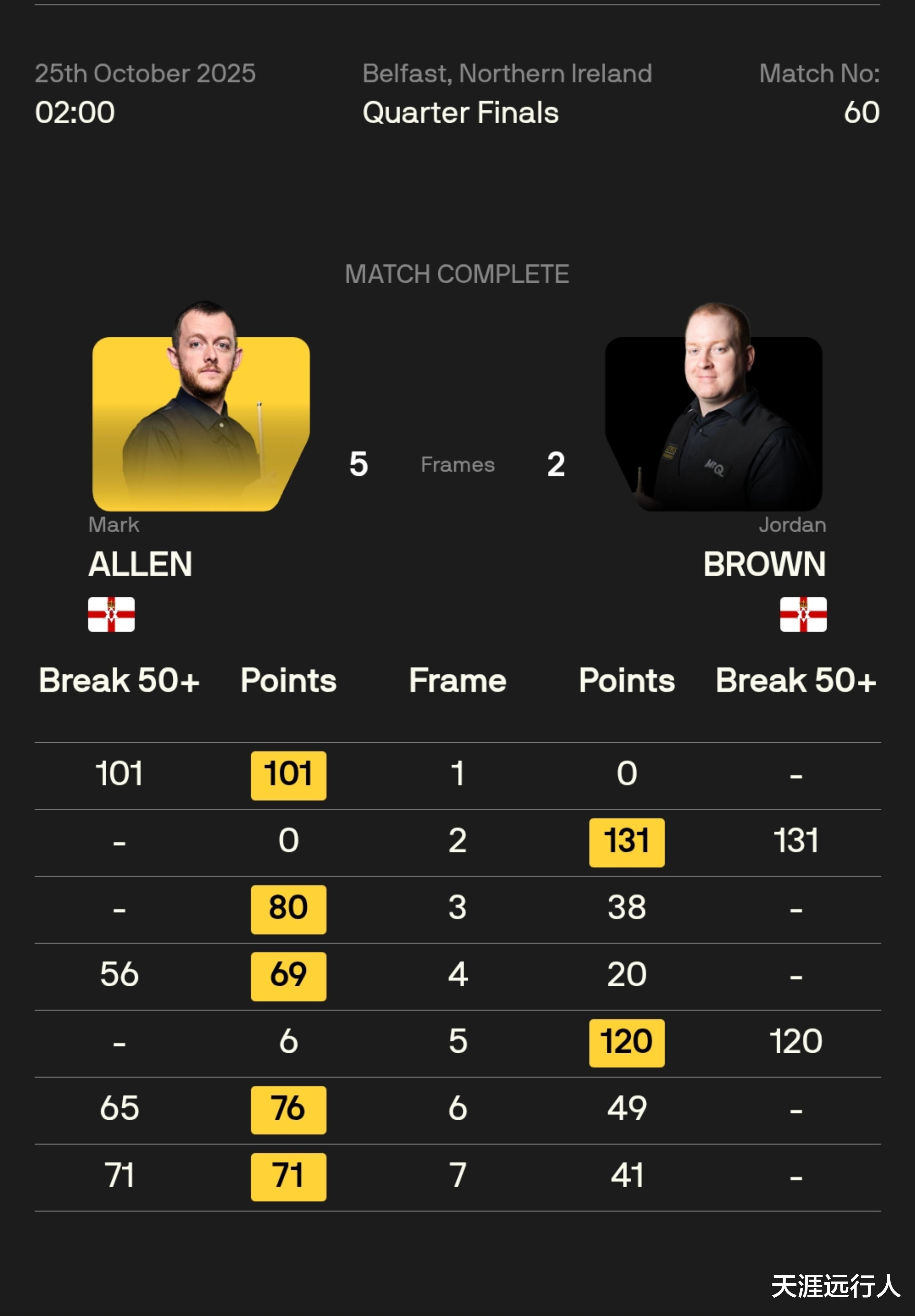 这场难得一见的北爱尔兰的德比,马克·艾伦全场打出一杆破百、三杆单杆50+,先后以1-0、3-1领先,乔丹·布朗拼力轰出两杆单杆过百,追成2-3,马克·艾伦一波两连击锁定胜利,在自己的第70次四强争夺战中,顺利过关。