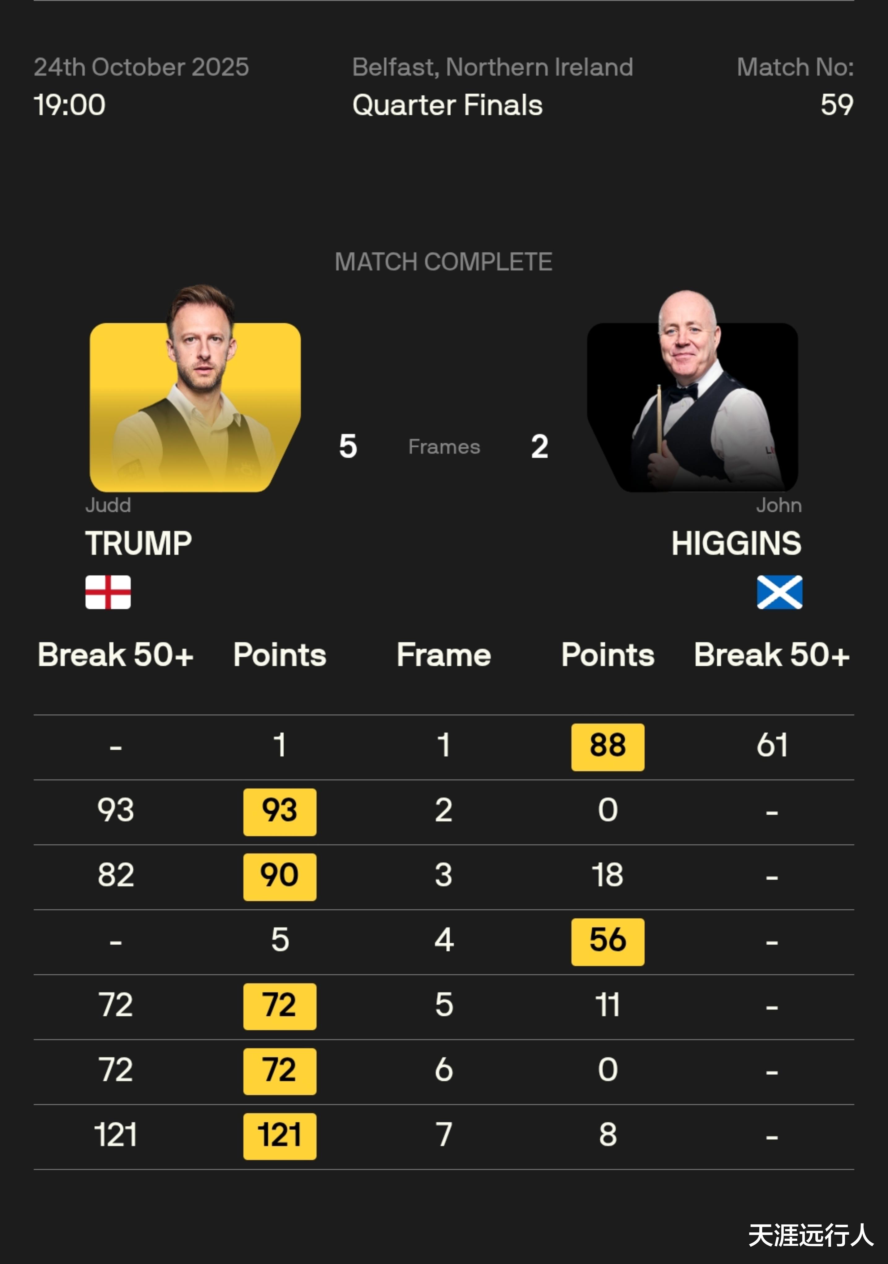 这个比赛日打出五杆单杆破百,其中小特完成了自己的第1110杆破百,一年前抢在特鲁姆普之前达成千杆破百里程碑的约翰·希金斯,迄今只打了1043杆,本场也是黯然出局。