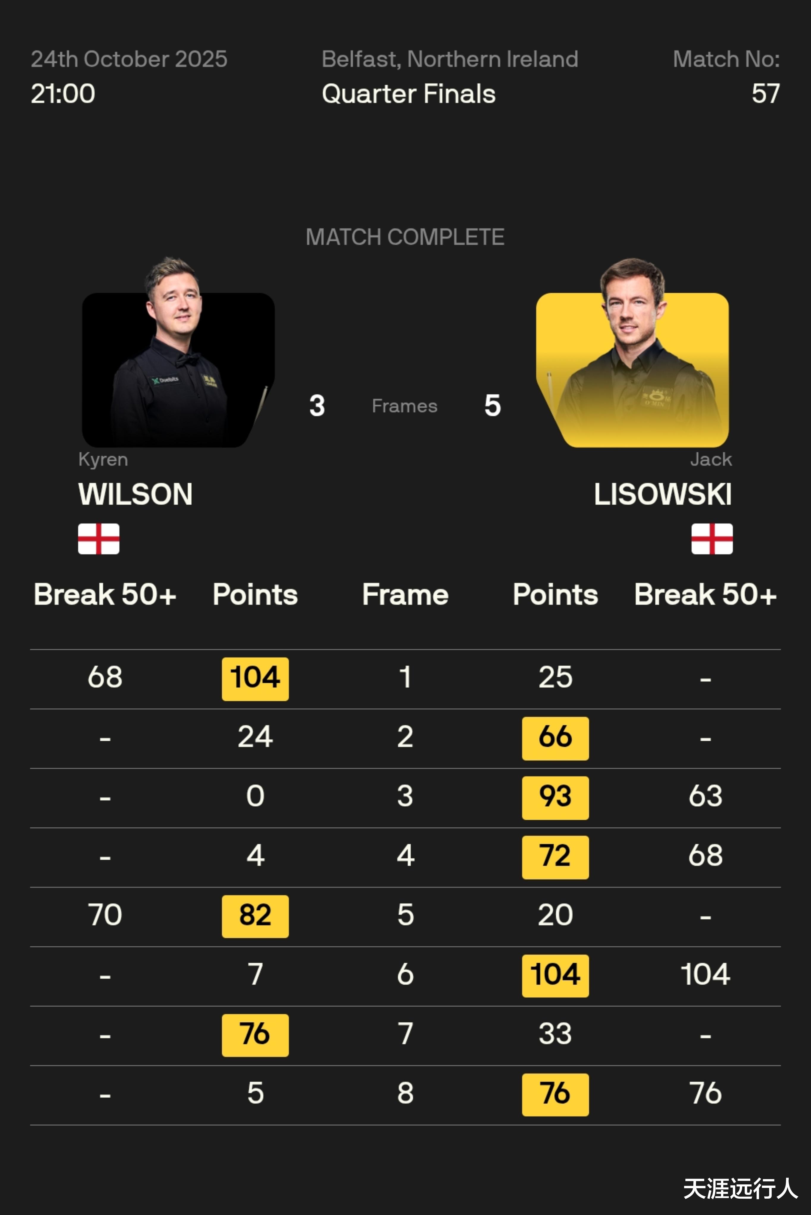 斯诺克的悲情角色、千年老二杰克·利索夫斯基,在与新教练克里斯·亨利合作之后,系统训练了母球走位与加塞技术,显著提升了防守稳定性,本就加持了不凡进攻准度的小司机,近来状态高企,特别是本站先后拿下马克·塞尔比和凯伦·威尔逊两大世冠,时隔两年再次闯进排名赛半决赛,上一次恰恰是在2023北爱尔兰公开赛,那一次是拿下里奇·沃顿之后,半决赛1-6不敌克里斯·韦克林。