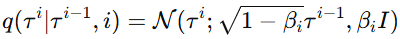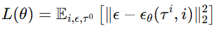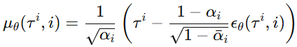反向过程则学习从噪声中恢复轨迹分布。论文并不直接学习后验均值,而是学习噪声项 (epsilon_ heta),对应的均值写成: